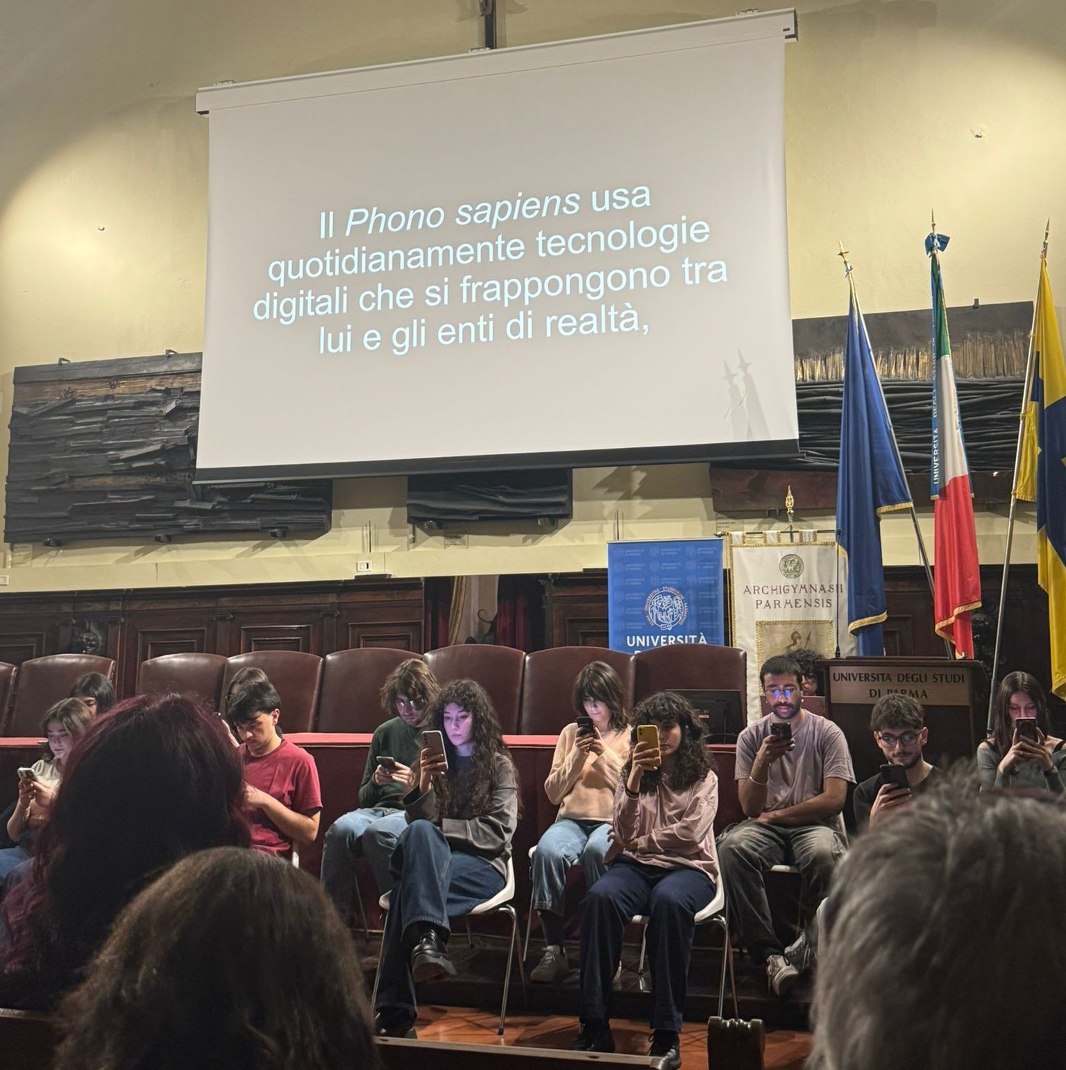 Insight non è una performance qualunque, ma una di quelle che, per le verità messe in luce, pian piano va a sedimentare un sapore amaro in bocca. È un progetto teatrale nato all’interno del CUT (Centro Universitario Teatrale) dell’Università di Parma, con la regia di Beatrice Baruffini e interpretato da studenti e studentesse dell’università. Quando venerdì scorso sono entrata in Aula Magna per vedere la performance, ammetto di avere avuto aspettative leggere, uscendo invece dall’Aula quasi commossa, soprattutto turbata: un senso di angoscia e tanti altri pensieri annessi che mi hanno accompagnata per tutto il viaggio di ritorno. La tematica dell’uso del cellulare nelle nuove generazioni e più in generale dell’uso di internet (diventato ormai parte fondamentale di noi) è stata messa in scena in un modo che non mi aspettavo.